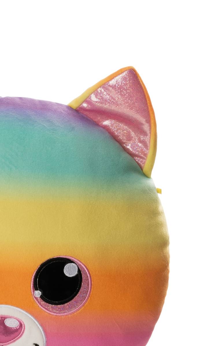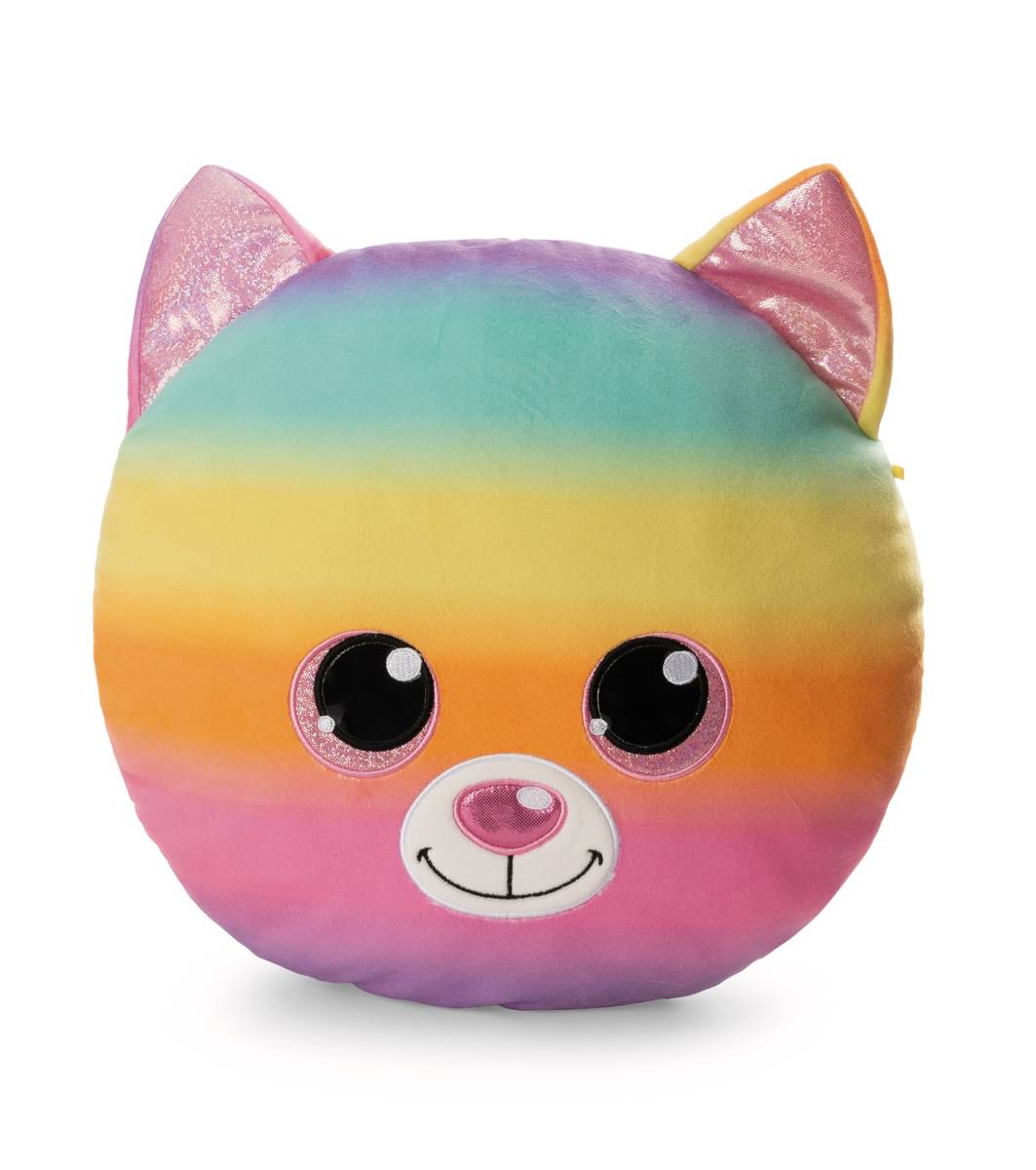Bunt wie ein Regenbogen präsentiert sich das runde GLUBSCHIS Katze Miss Mellie Kissen, das ein superflauschiger und bequemer Begleiter ist, der aus besonders softem NICI-Plüschmaterial besteht. In Form des niedlichen Katzen-Kopfes ist dieses Kissen nicht nur ideal zum Kuscheln, sondern auch ein wunderschöner Blickfang und Dekoelement fürs Sofa oder Bett. Das ausgefallene GLUBSCHIS Katze Miss Mellie Kissen begeistert mit den bunten Regenbogenfarben, einem niedlichen Gesichtsausdruck, pinken Glitzeraugen, einer rosa glänzenden Nase und den süssen Öhrchen aus Glitzermaterial. Das Kissen ist Kuschelkissen für unterwegs, bequeme Kopfunterlage beim Lesen oder Schlafen oder einfach ein weiteres Sammelobjekt für die eigene GLUBSCHIS Plüschwelt. Das perfekte Geschenk für kleine und grosse GLUBSCHIS Fans. (c) 2024 Carletto, licensed by NICI GmbH