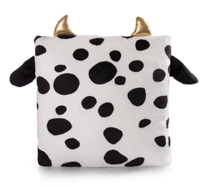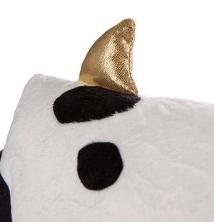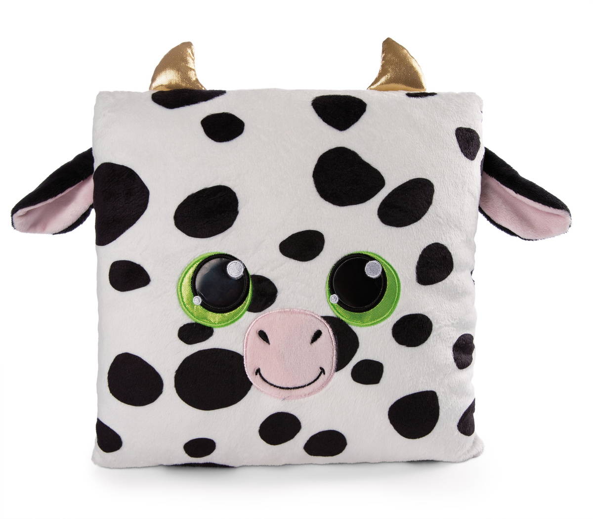 Das quadratische Plüschkissen GLUBSCHIS Kuh Moolon ist nicht nur flauschig weich, sondern begeistert mit einem bezaubernden Gesichtsausdruck, grossen, grünen Glitzeraugen, einer zartrosa-farbenen Nase, niedlichen Öhrchen und goldig schimmernde Hörner. Das Kissen aus schwarz-weiss geflecktem NICI-Plüsch ist ein wunderschöner Blickfang und Dekoelement fürs Kinderzimmer. Ob als Kuschelkissen für Übernachtungspartys oder auf Reisen, als bequeme Kopfunterlage zum Lesen oder Schlafen oder einfach als weiteres Sammelobjekt für die eigene GLUBSCHIS Plüschwelt - das GLUBSCHIS Kissen ist das perfekte Geschenk für kleine und grosse GLUBSCHIS Fans.