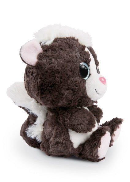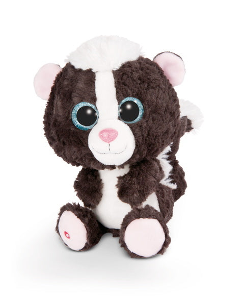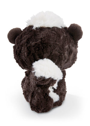 Schwarz-weisses flauschiges Fell, knuddeliger Gesichtsausdruck, grosse blau-glitzernde Augen. Das ist unser Stinktier Suppi von den GLUBSCHIS! Mit seinem wuscheligen Haarschopf auf den Kopf ist er ein kecker Freund und ein tolles Kuscheltier.