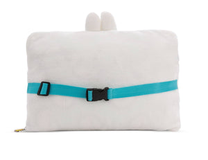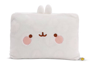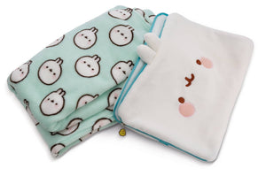 MOLANG Freunde aufgepasst! Die Kombi bestehend aus Fleecedecke und Kissen darf in keinem Fan-Haushalt fehlen! Mit dem praktischen Begleiter auf Reisen mit dem Auto, Flugzeug oder dem Zug sind Bequemlichkeit und unvergessliche Kuschelmomente vorprogrammiert. Auch der Besuch bei den Grosseltern oder die nächste Übernachtungsparty wird mit der 2in1 MOLANG Kuscheldecke und Kissen zum Wohlfühlerlebnis. Das kuschelig Kissenhülle in rechteckiger Form ist mit einem Reissverschluss ausgestattet, der mit einen Regenbogen Charm-Anhänger geöffnet oder geschlossen werden kann. In dem weissen Molang Kissen versteckt sich eine Fleecedecke in Pastellgrün mit einem Molang All-over Druck. Mit einer Grösse von 180x100cm ist die Decke für kleine und grosse MOLANG Fans geeignet. Das Kissen ist zusätzlich mit einem verstellbaren Gurt ausgestattet, so dass sich Kissen und Decke auch an einem Reisetrolley befestigen lassen.