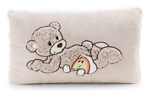 Mach es dir gemütlich mit dem trendigen Plüschkissen aus der Bears & Friends Kollektion von NICI in edlem Grau! Das rechteckige Kissen ist nicht nur ein echter Hingucker, sondern auch ein wahres Kuschelparadies. Die Vorderseite zieren aufwändige Plüschapplikationen von Bär Finni und dem fröhlichen Regenbogen Nibsi, die jedem Raum einen Hauch von Magie verleihen. Die Rückseite des Kissens besteht aus weissem, gelocktem Plüsch und lädt zum Verweilen und Entspannen ein. Ob als dekoratives Element in der Wohnung, zum Kuscheln auf der Couch oder als treuer Begleiter für süsse Träume im Bett - dieses Kissen ist vielseitig einsetzbar! Ein Muss für alle, die das Besondere lieben! Das Kissen ist Teil der NICI GREEN Produktwelt. Für NICI GREEN Produkte verwenden wir fast ausschliesslich Plüsch- und Füllstoffe, die aus recycelten Materialien bestehen. Hierfür werden vor allem alte PET-Flaschen zu RPET verarbeitet.