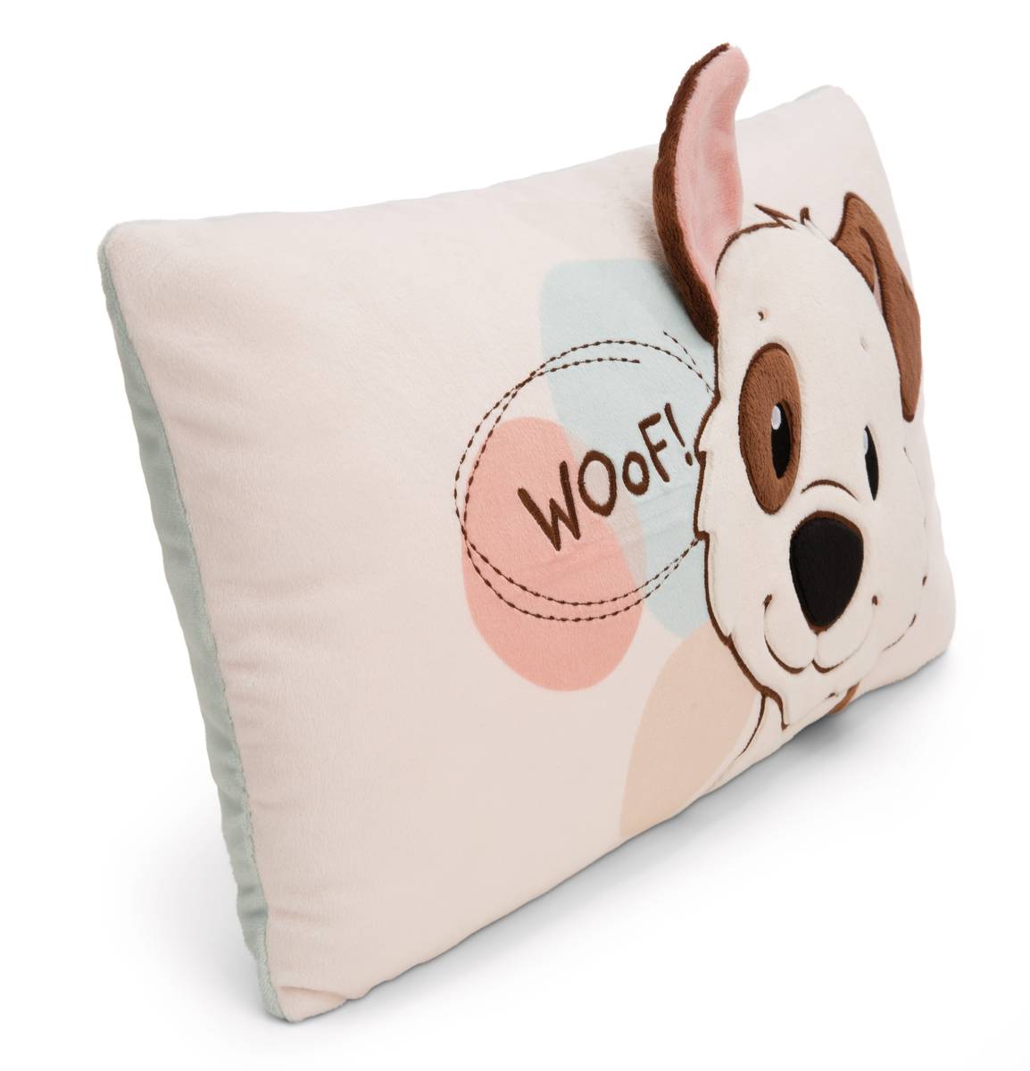 Woof, Hundefreunde aufgepasst! Das flauschig weiche, rechteckige Plüschkissen aus der Homies Kollektion von NICI ist mit eurer Lieblings-Fellnase bedruckt. Der fröhlich dreinblickende weisse Hund mit dem braun umrandeten Auge begeistert durch sein dreidimensionales Hundeohr, das dem Kissen eine verspielte Note verleiht. Ob zum Kuscheln, Schmusen, Schlafen, auf Reisen oder als dekoratives Wohnaccessoire - das niedliche Kissen ist vielseitig einsetzbar und sorgt für die richtige Gemütlichkeit. Die zarten Pastellfarben harmonieren wunderbar mit verschiedenen Einrichtungsstilen und zaubern eine fröhliche Atmosphäre. Ob für kleine oder grosse Hundefans, das Plüschkissen ist ein ideales Geschenk oder eine liebevolle Ergänzung für das eigene Zuhause. Das Kissen ist Teil der NICI GREEN Produktwelt. Für NICI GREEN Produkte verwenden wir fast ausschliesslich Plüsch- und Füllstoffe, die aus recycelten Materialien bestehen. Hierfür werden vor allem alte PET-Flaschen zu RPET verarbeitet.