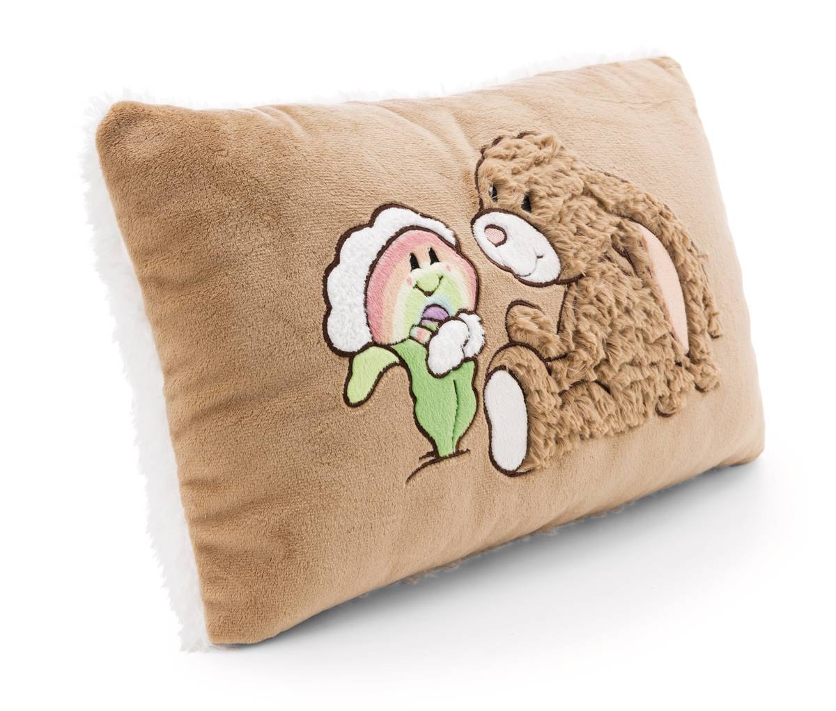 Mach es dir gemütlich mit dem trendigen Plüschkissen aus der Bears & Friends Kollektion von NICI in einem angesagtem Braunton! Das rechteckige Kissen ist nicht nur ein echter Hingucker, sondern auch ein wahres Kuschelparadies. Die Vorderseite zieren aufwändige Plüschapplikationen von Hase Lopino und dem fröhlichen Regenbogen Nibsi, die jedem Raum einen Hauch von Magie verleihen. Die Rückseite des Kissens besteht aus weissem, gelocktem Plüsch und lädt zum Verweilen und Entspannen ein. Ob als dekoratives Element in der Wohnung, zum Kuscheln auf der Couch oder als treuer Begleiter für süsse Träume im Bett - dieses Kissen ist vielseitig einsetzbar! Ein Muss für alle, die das Besondere lieben! Das Kissen ist Teil der NICI GREEN Produktwelt. Für NICI GREEN Produkte verwenden wir fast ausschliesslich Plüsch- und Füllstoffe, die aus recycelten Materialien bestehen. Hierfür werden vor allem alte PET-Flaschen zu RPET verarbeitet.