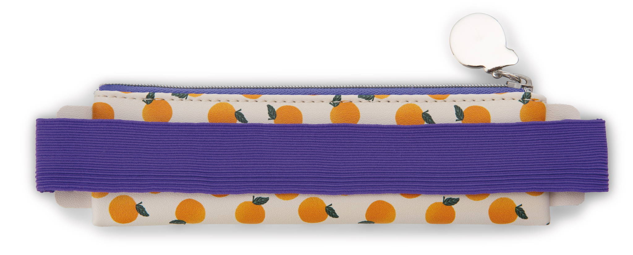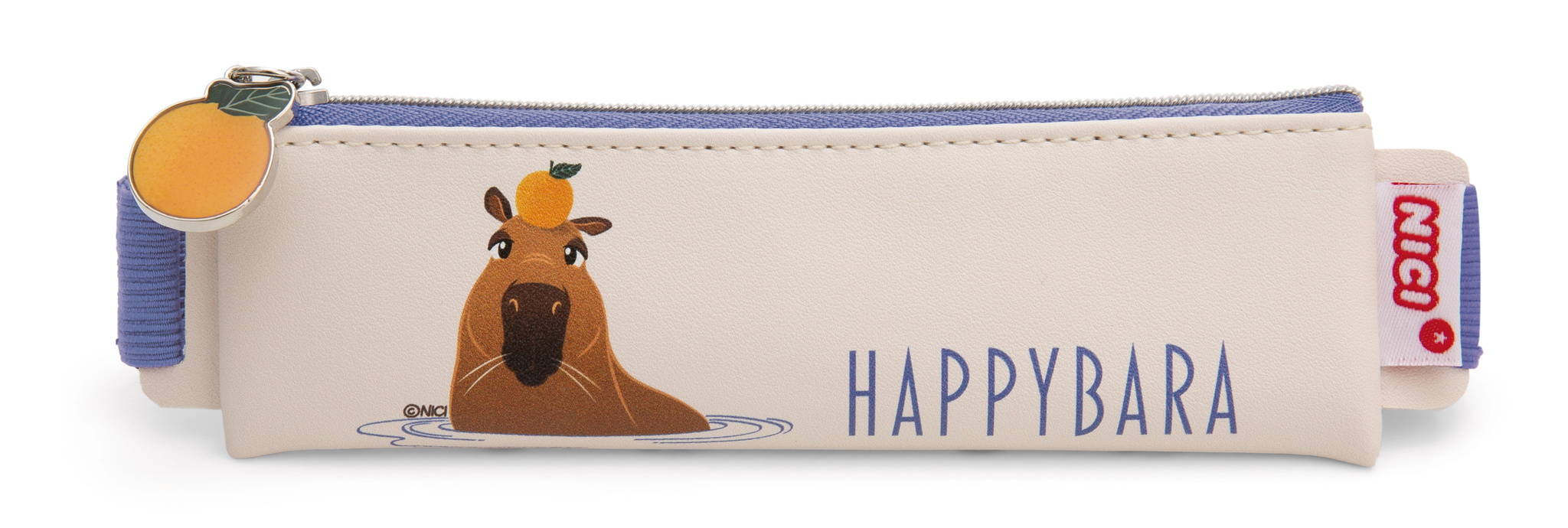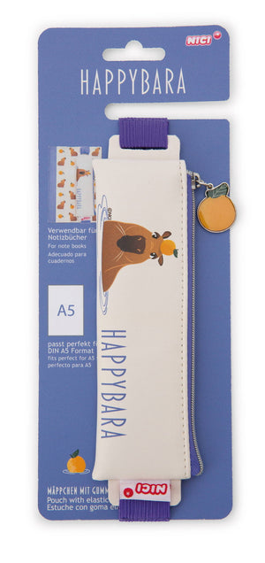 Das flache Mäppchen aus strapazierfähigem PU-Material ist gleichermassen für Schule, Beruf oder die Handtasche, z.B. als Stiftemäppchen, für Kosmetik oder Getöns, geeignet. Mit Hilfe des breiten Gummibands kann es sicher an jedem DIN A5 Block befestigt werden und der Charm-Anhänger aus Metall sorgt für ein leichtes Öffnen und Schliessen des Reissverschlusses. Die Vorderseite des Mäppchens zeigt ein badendes Capybara mit Orange auf dem Kopf und den Schriftzug "Happybara".