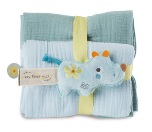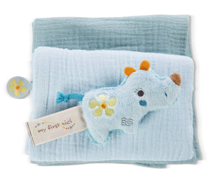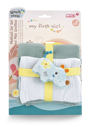 Eine wundervolle Geschenkidee zur Geburt oder als kleine Aufmerksamkeit für zwischendurch ist das 2er-Set Mulltücher, das mit dem plüschigen Greifling Nashorn Manuffi kommt und mit Hilfe eines farbigen Textilbandes zusammengehalten wird. Wunderbar weich und mit saugfähiger Crincle-Struktur machen die beiden unterschiedlich farbigen Musselintücher in der Grösse 60 x 60 cm nicht nur beim Füttern oder Stillen einen guten Job. Der zuckersüsse Greifling Nashorn Manuffi aus kuschelweichem NICI Plüsch und einer Grösse von 9 cm ist einfach zum Verlieben. Mit seinen liebevollen Details ist der Greifling für Babys perfekt zum Halten und Entdecken.