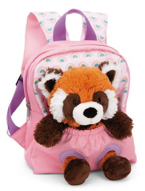 Wer geht schon gerne ohne sein liebstes Kuscheltier aus dem Haus? Mit dem NICI Rucksack im rosafarbenen Regenbogen Design wird zauberhaftes Kuschelvergnügen mit der Funktionalität eines geräumigen Kinderrucksacks verbunden. Ein einzigartiger Roter Panda aus flauschig weichem NICI-Plüsch ist in einer separat befestigten Sitztasche mit Gummizug fixiert und schaut sich die Welt vom Rücken des Kindes mit an. Das 25cm grosse Plüschtier kann dabei kinderleicht zum Schmusen, Spielen und Liebhaben herausgenommen werden. Für einen guten Tragekomfort dienen gepolsterte und verstellbare Schultergurte sowie ein angenehm weicher Rückenbereich in bewährter NICI-Qualität. Der Rucksack, mit integriertem Namensschild, ist ein wundervolles Geschenk und idealer Begleiter für alle kleinen Abenteurer, Weltentdecker und Backpacker.