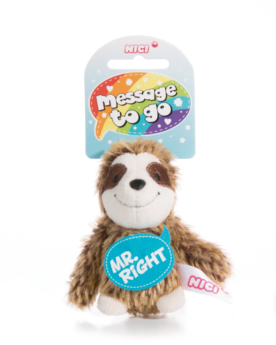 Mr. Right" so lautet die Aufschrift auf der blauen Filzsprechblase,die das wuschelige Faultier,präsentiert. Ein witziger Anhänger für alle,die ihren ganz persönlichen Mr. Right überraschen möchten. Die elastische Schlaufe am Kopf des Tierchens macht ihn zu einem tollen Begleiter,der fast überall einen Platz findet: zum Beispiel an der Tasche,am Rückspiegel des Autos oder am Schlüsselbund.