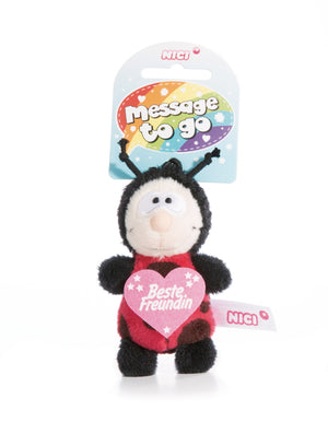 Der Marienkäfer ist seit jeher ein Glücksbringer. NICI hat nun einen besonders süsse Version des kleinen Tierchens herausgebracht. Mit seiner elastischen Schlaufe am Kopf und dem rot schwarz gepunkteten Körper freut sich der Marienkäfer darauf an die beste Freundin verschickt zu werden. Als i-Tüpfelchen präsentiert der Marienkäfer ein pinkes Herz mit der Aufschrift "Beste Freundin".