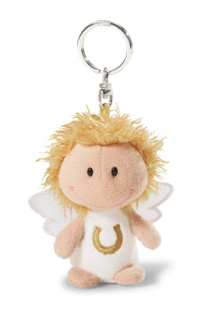 Ein Engel-Schlüsselanhänger aus Plüsch von NICI ist ein toller Glücksbringer. Das Engelchen hat goldblondes Haar und trägt ein weisses Kleid, auf dem ein goldenes Hufeisen aufgestickt ist.