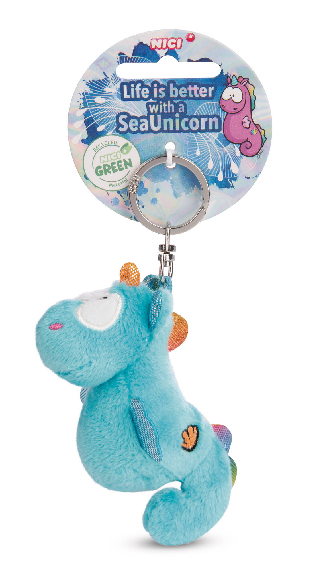 So einzigartig und so süss! Die zauberhafte Laguna Rainbow, ein flauschig weiches Seepferdchen mit dem Stirnhorn eines magischen Einhorns, begleitet ihre Fans im Alltag getreu dem Motto Life is better with a sea unicorn". Mit Hilfe eines stabilen Metallrings am Kopf kann das 9cm grosse Plüsch-Seehörnchen am Schlüsselbund, Rucksack oder Schulranzen befestigt werden. Das blaue Meerestier ist ein liebenswertes Geschenk für Gross und Klein und begeistert durch den sanft geschwungenen Körper, das glitzernde Kopfhorn, eine gestickte Muschel auf der Flanke und kleine Flossen in Regenbogenfarben. Der Schlüsselanhänger ist Teil der NICI GREEN Produktwelt. Für NICI GREEN Produkte verwenden wir fast ausschliesslich Plüsch- und Füllstoffe, die aus recycelten Materialien bestehen. Hierfür werden vor allem alte PET-Flaschen zu RPET verarbeitet.