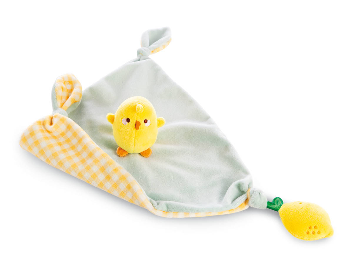 Piu Piu, der beste Freund in der MOLANG TV-Serie und bekannt aus Social Media, ist als Schmusetuch ein unverzichtbarer Begleiter in den ersten Lebensmonaten des Babys. Das entzückende Nuckeltuch findet überall seinen Platz, ob im Bettchen, Kinderwagen oder Autositz. Piu Piu ist als figürliches Kuscheltier auf dem doppelseitig gestalteten Schmusetuch in den Farben Pastellgrün und Gelb befestigt. Die Knoten und eine lustige Plüschzitrone an den Zipfeln des dreieckigen Kuscheltuchs laden das Baby spielerisch zum Greifen und Festhalten ein.