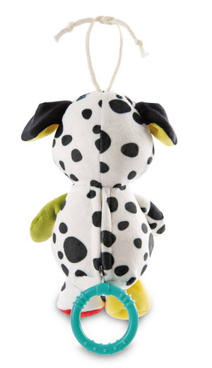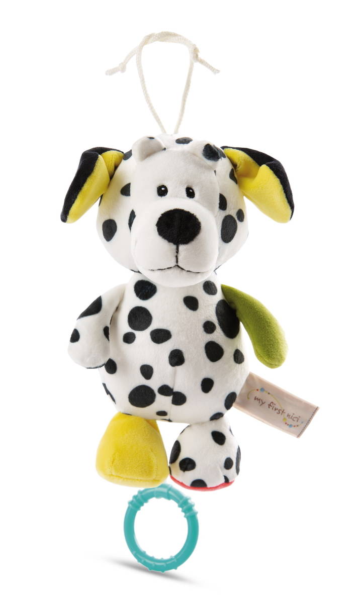 Die plüschige Spieluhr in Gestalt eines lustig gepunkteten Dalmatiners mit quietschgelben Ohrinnenseiten und unterschiedlich farbigen Armen und Beinchen ist ein unverzichtbares Geschenk zur Geburt oder Taufe. Zieht man an dem kleinen Ring, der mittels einer Schnur am softig weichen Körper des 18 cm grossen Hundes befestigt ist, kommt die eingearbeitete Spieluhr zum Einsatz und Baby wird mit Brahms Wiegenlied ins Reich der Träume begleitet. Mit Hilfe von zwei Bändchen lässt sich die Spieluhr ganz einfach am Bettchen, Kinderwagen oder Babyschale befestigen. Die Spieluhr Dalmatiner aus der MyFirstNICI Kollektion ist eine tolle Einschlafhilfe und fördert gleichzeitig motorische und sensorische Fähigkeiten der Allerkleinsten.