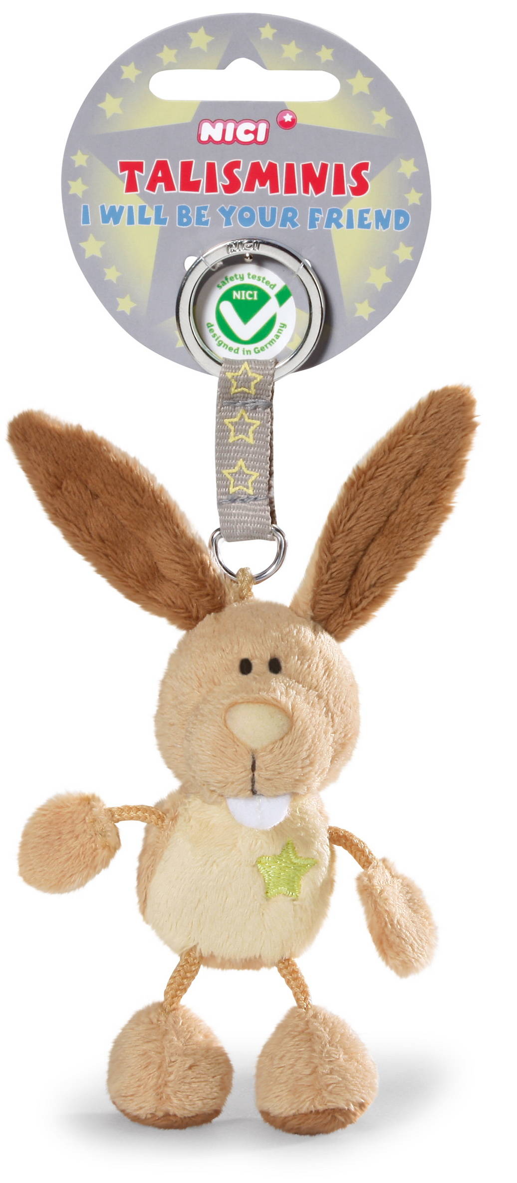 Der NICI Hase als Schlüsselanhänger aus Plüsch. Als kleiner Glücksbringer schwingt er am Metallring. Auf seiner Brust ist ein aufgestickter Stern zu sehen.