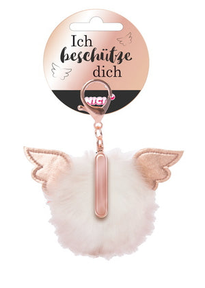 Ein rosé-goldfarbener Buchstaben I, schimmernde Flügelchen und ein filigraner Karabiner zur einfachen Befestigung an Tasche oder Rucksack machen den Schutzbommel zu einem tollen Accessoire.